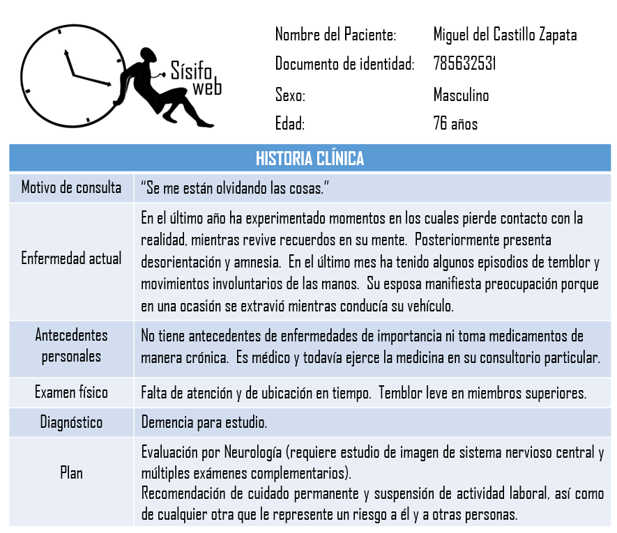 ¿Cómo llegué aquí? No tengo idea. Debo estar empeorando. Trato de repasar el día. ¿Qué es lo último que recuerdo? La mañana transcurrió como es usual… Tuve varios pacientes en el consultorio y estoy seguro de que uno me lo envió el padre Rogelio… Doña Norma me trajo a su mamá, que debe tener una infección urinaria... Vinieron los muchachos de la Acción Comunal para pedirme apoyo con lo de las fiestas de la juventud, o algo así... Le pedí a Marcela que me revisara qué pasó con el pago del impuesto predial… Vino a saludarme la Doctora seria que trabajó conmigo, y como siempre, le pedí que volviera, ¿cómo era que se llamaba?... Don Alfonso me trajo unos buñuelos para agradecerme, porque en estos días lo remití sin perder tiempo a urgencias, después de que en la EPS le dijeran que “eso no era nada” y parece que ya se recuperó de la cirugía… Inés vino otra vez a pedirme que le ayude “para hacer algo con esos vagos mariguaneros” del barrio… Don Jairo vino a cambiar la reja de la puerta. ¡Ah, sí! Y vino esa hermosa visitadora médica que nunca me acuerdo cómo se llama. Pero eso no es culpa de la demencia, es que me recuerda tanto a Laurita, que nunca me le aprendí el nombre.