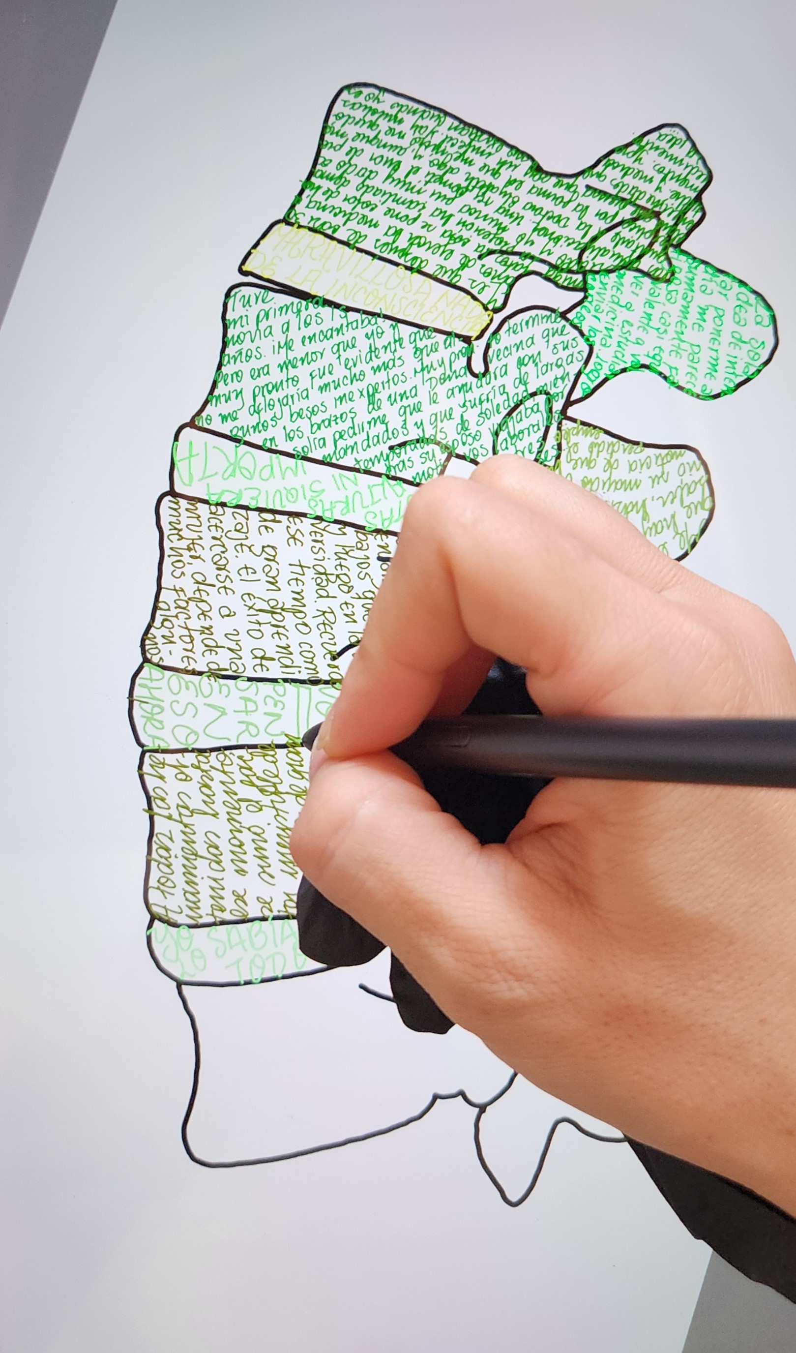 Las ilustraciones que acompañan a las narraciones corresponden a “caligramas”, que son imágenes compuestas de texto y construidas a partir de fragmentos de los relatos, con una técnica propia desarrollada a lo largo del proceso.